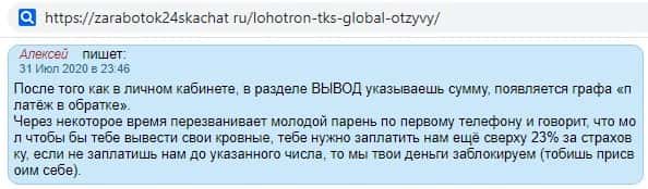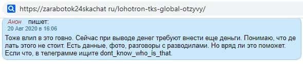 Обманутый клиент компании TKSGlobal в своем отзыве на сайте zarabotok24skachat ru сообщает, что эти аферисты для вывода средств требуют еще внести деньги.
