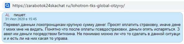 Удивленный клиент компании TKSGlobal сетует в своем отзыве на то, что заплатил немалую сумму денег, а мошенники для вывода требуют еще какую-то страховку.