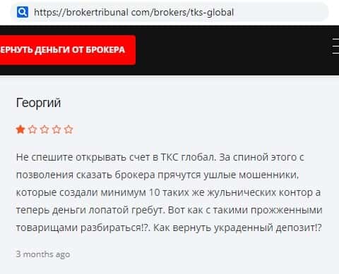 Обманутый трейдер в своем отзыве на сайте brokertribunal com задается вопросом, как вернуть украденный в ТКС Глобал депозит, и советует не спешить открывать счет.