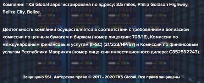 Лицензии на право финансовой деятельности на сайте псевдоброкера TKSGlobal Net не представлены, приведены сведения о лицензионных документах Белиза и Республики Маврикий.