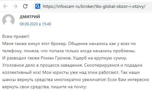 Обманутый трейдер в своем отзыве на сайте infoscam ru сообщает, что мошенники из TKS Global обманули его на крупную сумму, и он призывает подать на них коллективный иск.