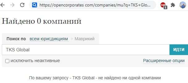 В базе данных аналитического сайта opencorporates com компания TKS Global, зарегистрированная в государстве Маврикий, почему-то не найдена, что вызывает сомнения в ее легальности.