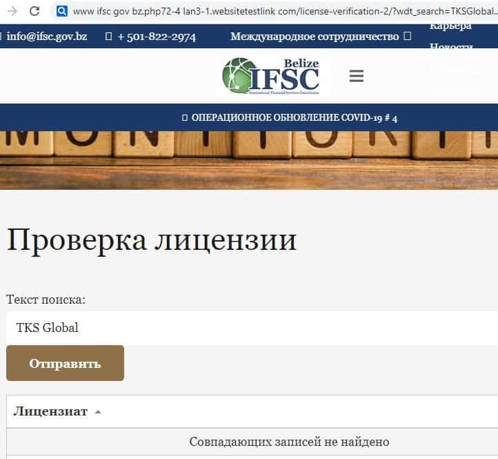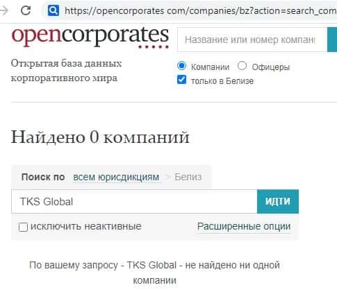 В базе данных аналитического сайта opencorporates com компания TKS Global, зарегистрированная в Белизе, почему-то не найдена, что вызывает сомнения в ее легальности.