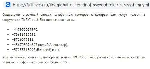 Телефонные номера аферистов из компании ТКС Глобал, найденные на интернет-ресурсе fullinvest ru.