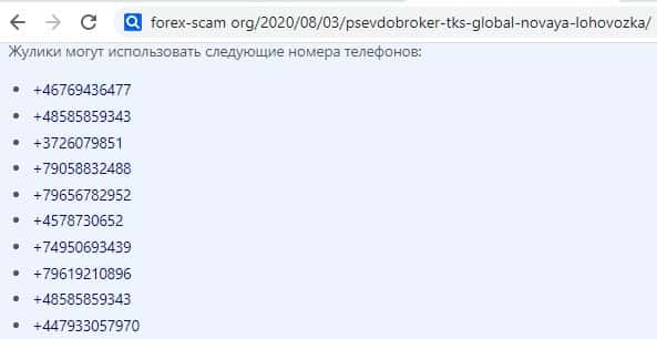 Телефонные номера мошенников из компании ТКС Глобал, найденные на интернет-ресурсе forex-scam org.
