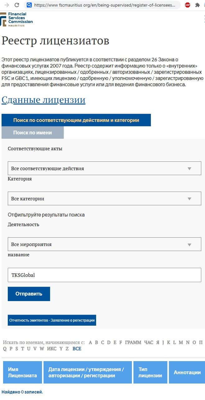 На сайте Комиссии по финансовым услугам Республики Маврикий в реестре лицензиатов брокерская компания TKSGlobal не зарегистрирована.