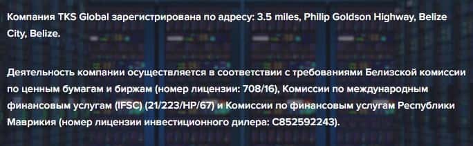 Компания ТКС Глобал, по данным с ее сайта регулируется Белизской комиссией по ценным бумагам и биржам и Комиссией по финансовым услугам Республики Маврикий.
