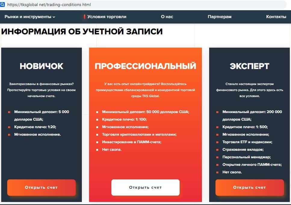 Мошенники из ТКС Глобал предлагают три типа счетов для торговли: Новичок, Профессиональный и Эксперт, и только один соответствует рыночным условиям, так как реальный Форекс начинаться с 100 000$.