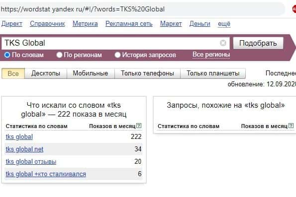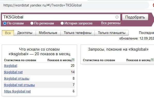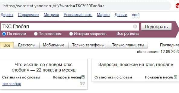 Поисковых запросов по англоязычному бренду "TKSGlobal" без пробела на сайте Яндекс Вордстат выявлено 20 случаев в месяц.