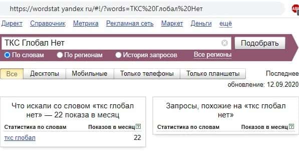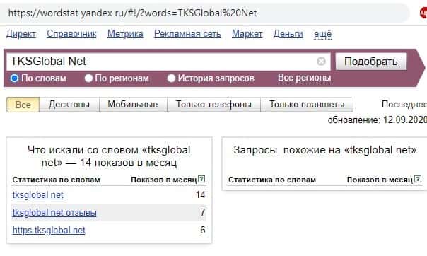 Сведения о брендовых запросах TKSGlobal Net на wordstat yandex ru