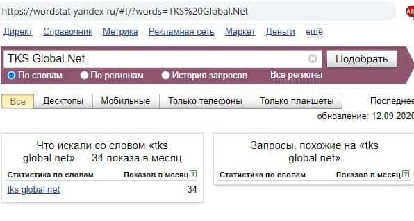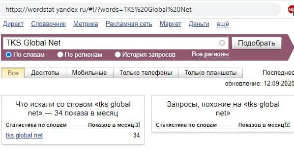 Поисковых запросов по англоязычному бренду "TKS Global.Net" с пробелом и с точкой на сайте Яндекс Вордстат выявлено 34 случая в месяц.
