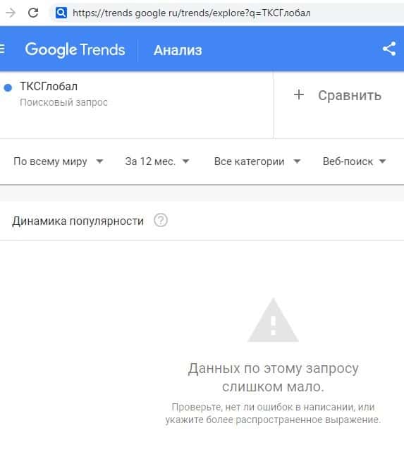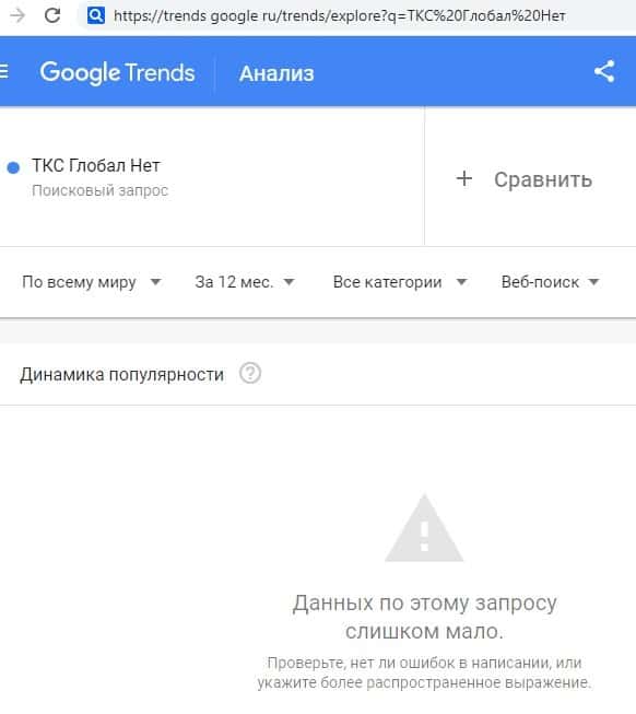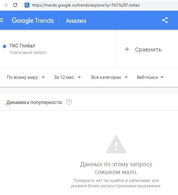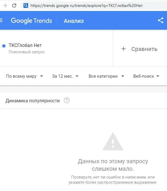 Поисковых запросов по русскоязычному бренду "ТКС Глобал Нет" на сайте trends google ru не выявлено, или слишком мало данных.