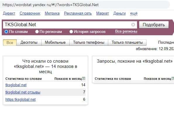 Поисковых запросов по англоязычному бренду "TKSGlobal.Net" без пробела и с точкой на сайте Яндекс Вордстат выявлено 14 случаев в месяц.