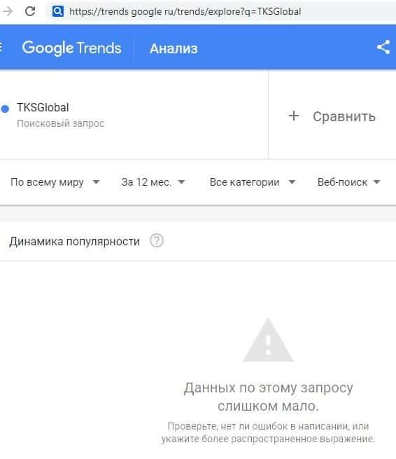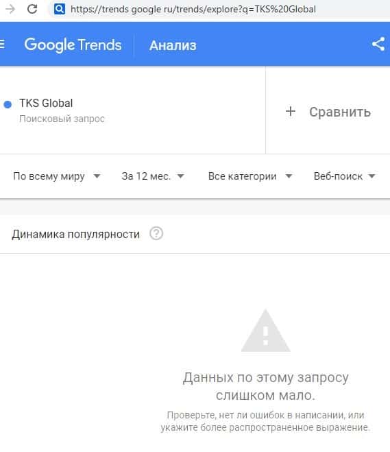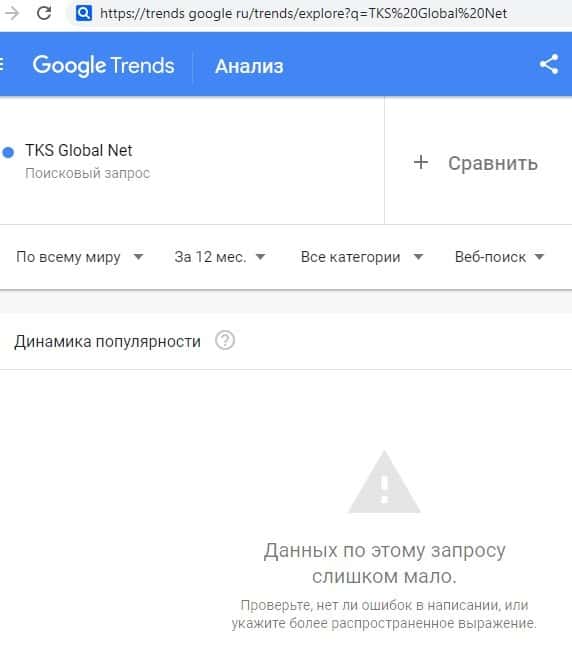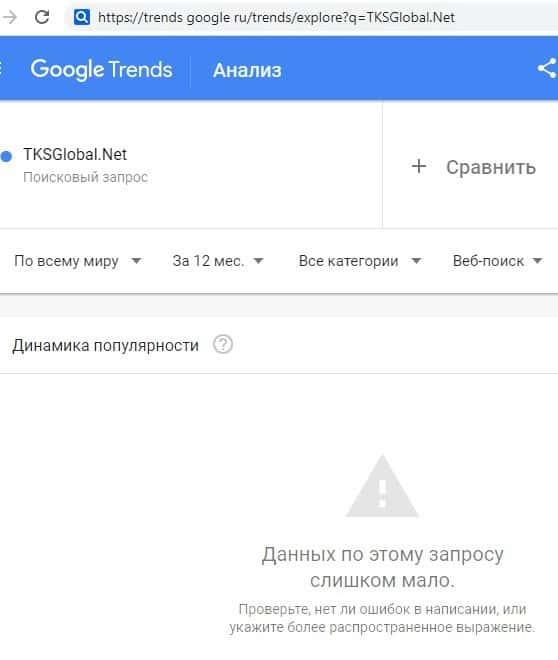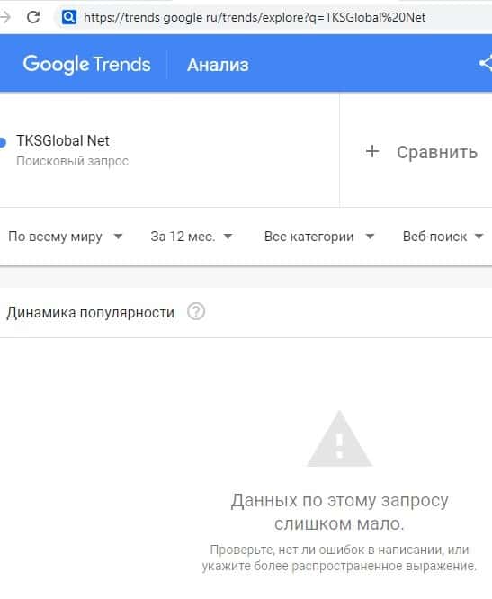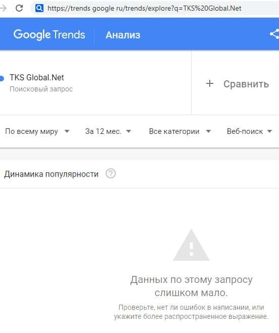 Поисковых запросов по англоязычному бренду "TKS Global.Net" с пробелом и с точкой на сайте trends google ru не выявлено, или слишком мало данных.