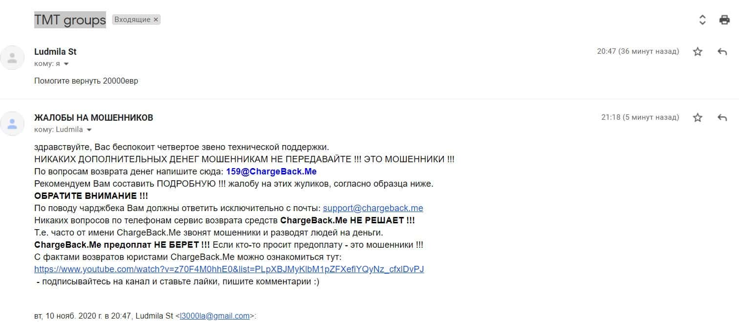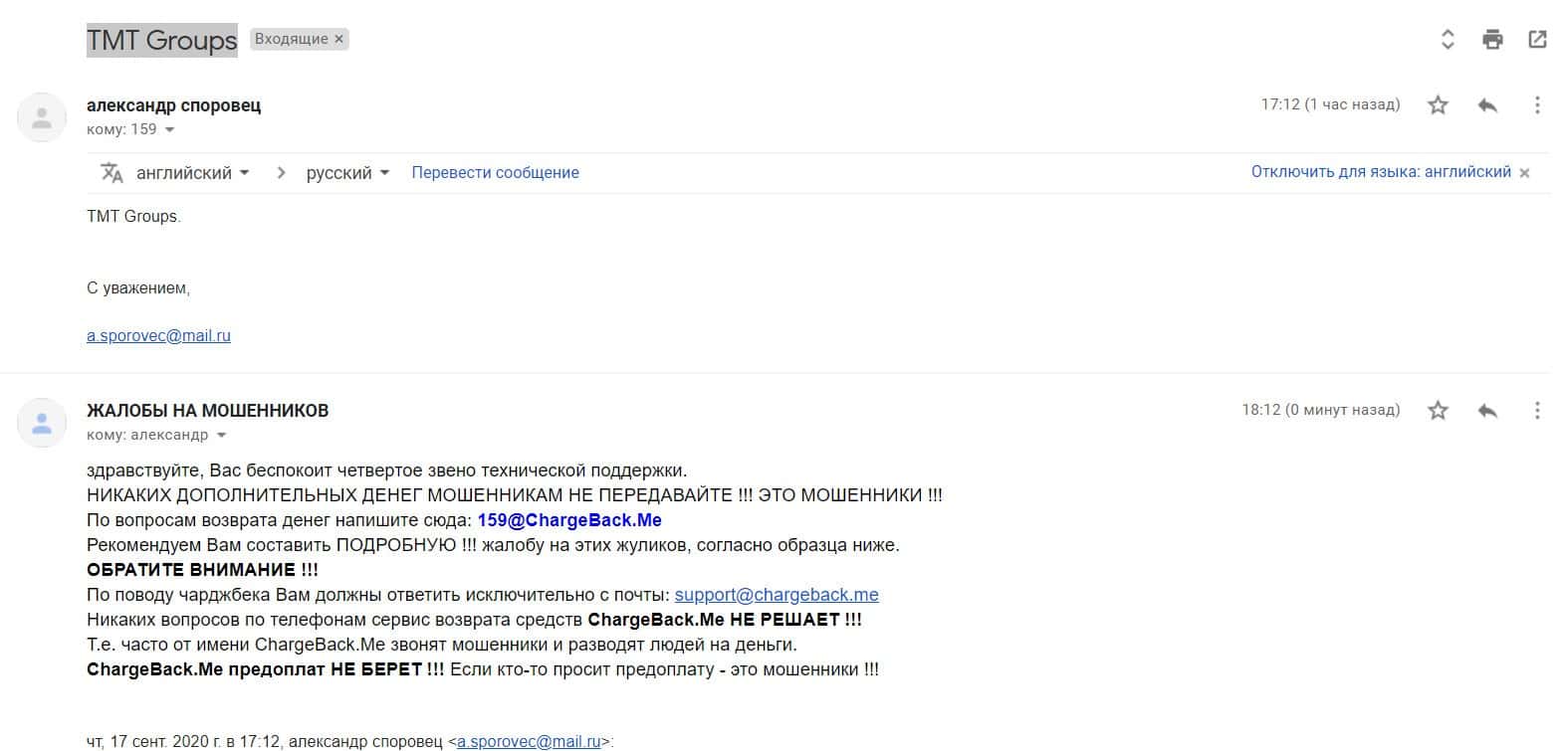Еще один способ связи мошенниками ТМТ Группс - адрес электронной почты. Как известно, писать сюда после кражи средств бесполезно. Кидалы нагло игнорируют пострадавших: