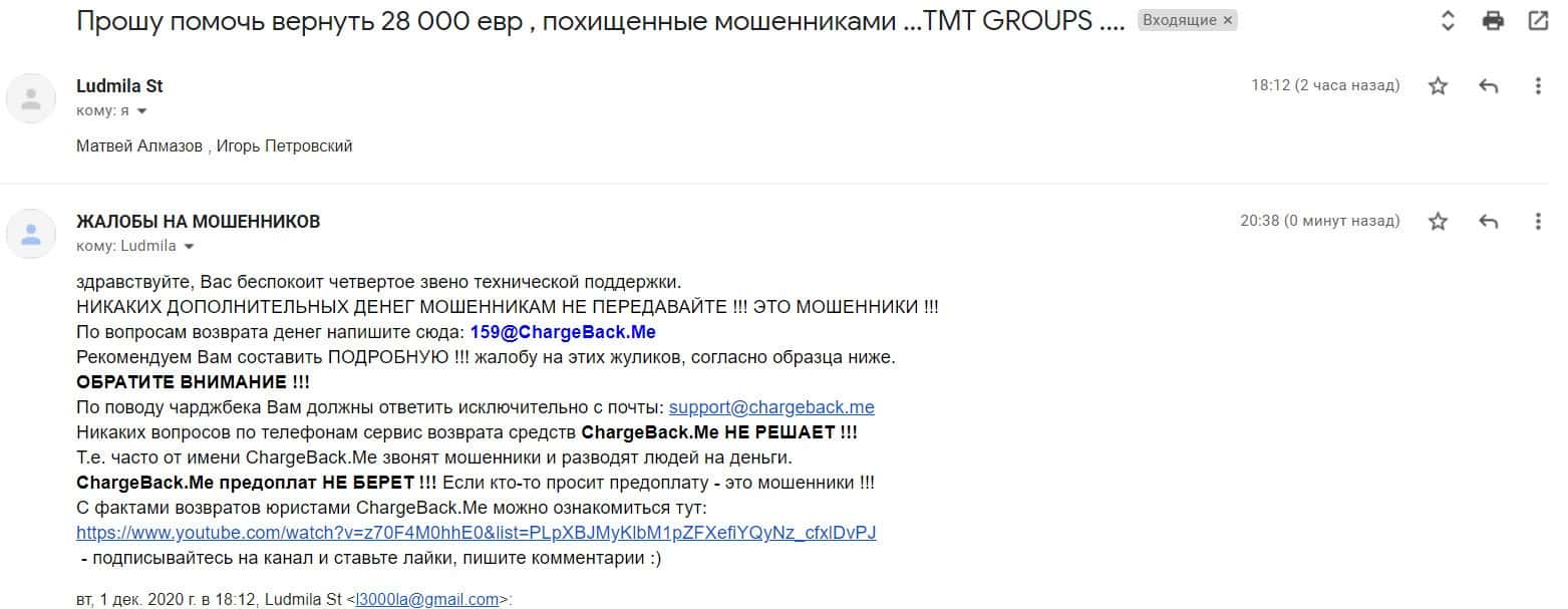 В некоторых случаях мошенники ТМТ Группс просто игнорируют запросы трейдера и перестают выходить на связь. Как бы то ни было, добровольно лохотронщики денег не отдадут.