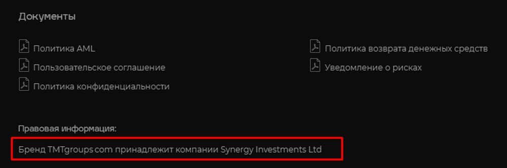 Махинаторы ТМТ Группс вроде предоставляют юридическую информацию, но она вся липовая, это несложно проверить. Никакой брокерской лицензии и регистрации у них нет.