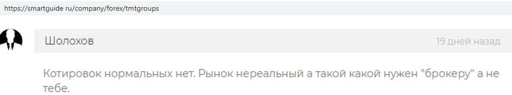 Трейдеры отмечают, что шарага TMTGroups не предоставляет нормальных котировок, а вся торговля ведется на платформе-песочнице, а графики выстраиваются, чтобы сливать деньги.