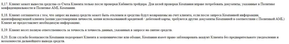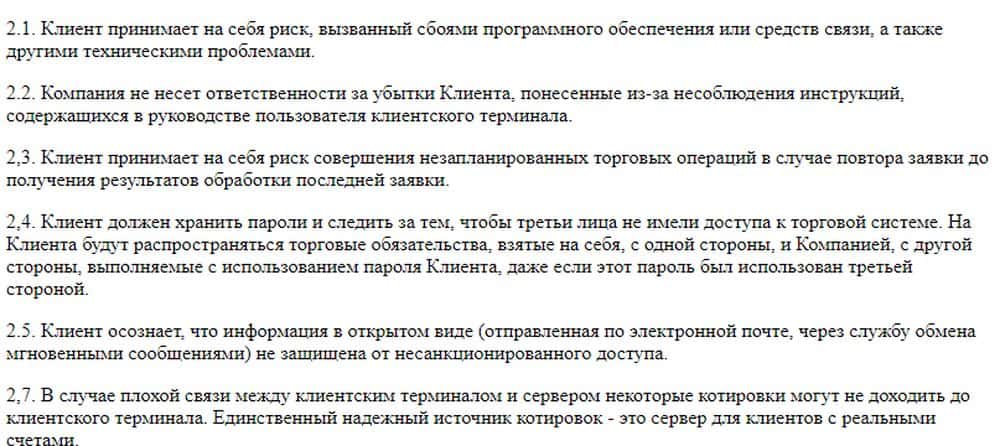 Как сообщают трейдеры, настоящий договор отличается от того, что на сайте, и приходит только после регистрации. Он составлен так же небрежно и полон стандартных ловушек.