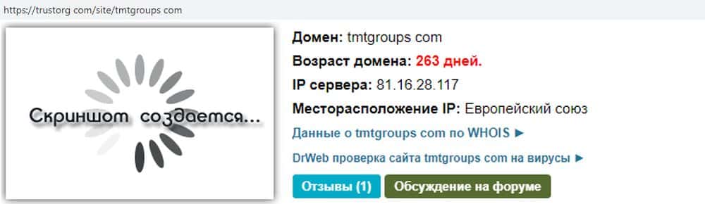 Онлайн-ресурс трасторг ком показывает, что онлайн-лохотрону ТМТ Группс меньше года. Понятно, что все россказни о там, что шарага якобы работает с 2014 - откровенное вранье.