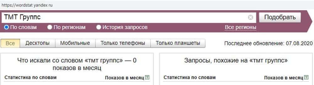И даже с запросом в латинской транслитерации "TMTGroups" история та же. Ни одного показа за год - вот и верь после этого в легенду о "международной" конторе с долгой историей.