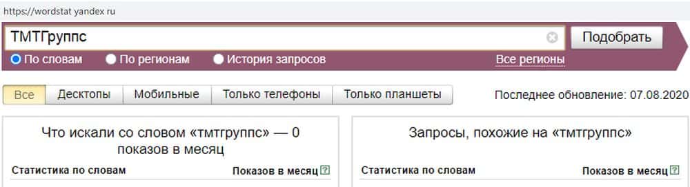 Тот же результат получаем по запросу "ТМТГруппс" - ни единого обращения к поисковику Яндекс за месяц. Это очередное очевидное доказательство, что перед нами простой лохотрон.