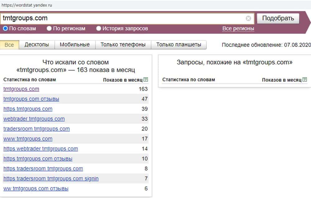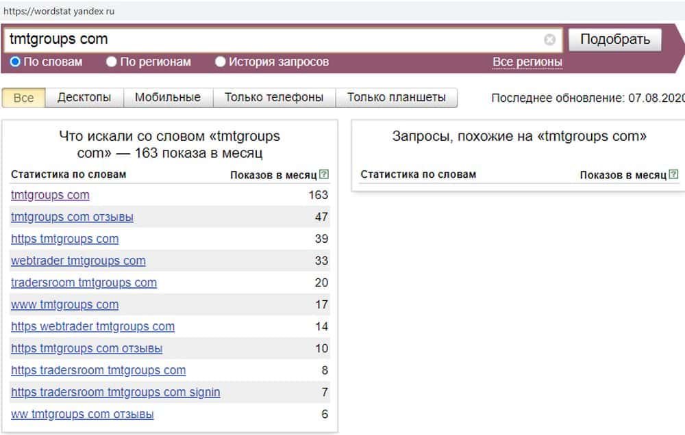 Домен катал ТМТ Группс пользователи Яндекс тоже ищут. По запросу "tmtgroups com" 163 показа за месяц. Трейдеры пытаются разобраться в афере, чтобы не попасть в ловушку кидал.