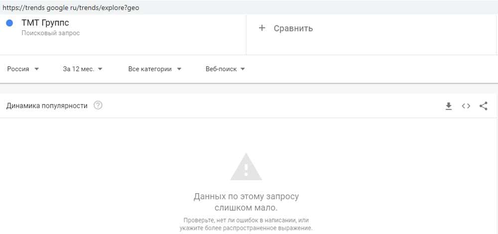 Среди пользователей Гугл веб-лохотрон ТМТ Группс вообще не пользуется популярностью. По запросу "ТМТ Группс" к поисковику никто не обращался в течение прошедшего года.