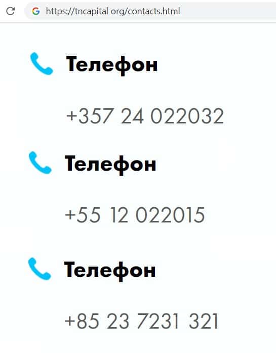 Финансовые аферисты TNCapital Org на своём главном сайте указали номера телефонов, с которых администрация проекта звонил клиентам и разводит на деньги. Номера разводил: