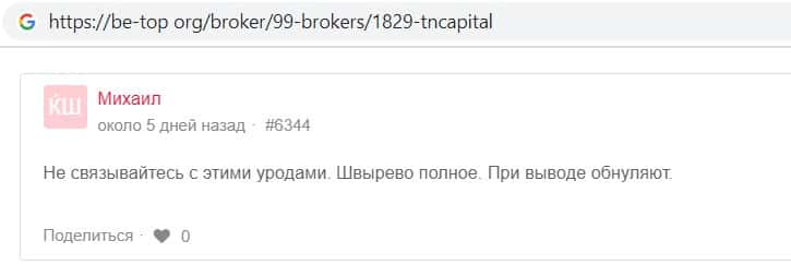 Очередной пользователь написал отзыв, в котором сказал пользователям не доверять конторе кидал ТН Капитал, так как они жулики и обнулили его счёт при выводе средств.