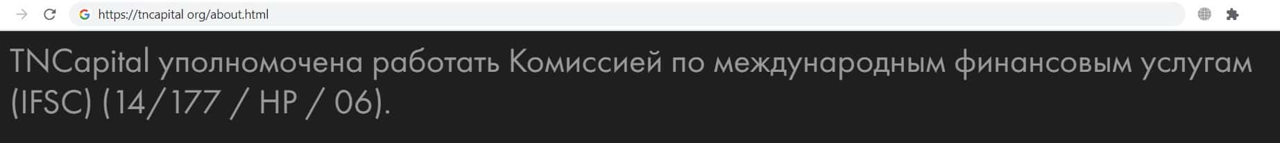 TNCapital Org что бы обмануть клиентов указал что имеет регулятора, но данным регулятором является мошенник IFSC, который регулирует различные мошеннические проекты.