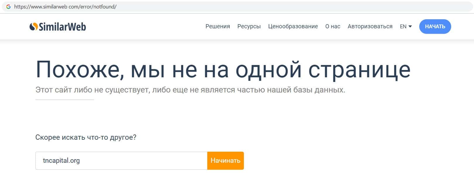 С помощью сайта similarweb com мы решили узнать трафик главного сайта TNCapital Org. оказалось, что международный сервис не обладает информацией о данных разводилах.