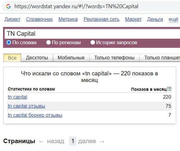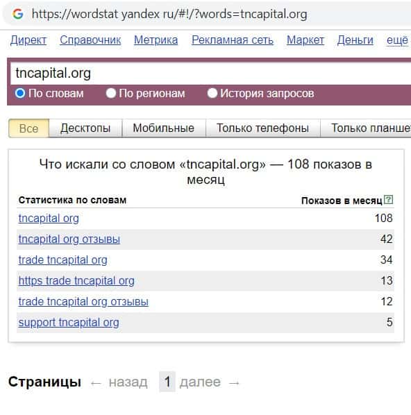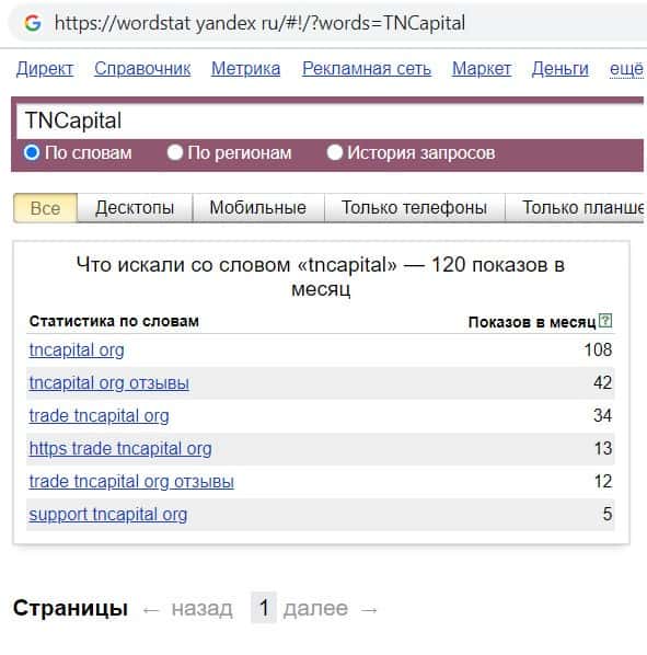 Проверили мы так же количество запросов разводил TNCapital Org по русскоязычному названию компании, а именно "ТН Капитал", но и этот запрос пользователи не выполняли.