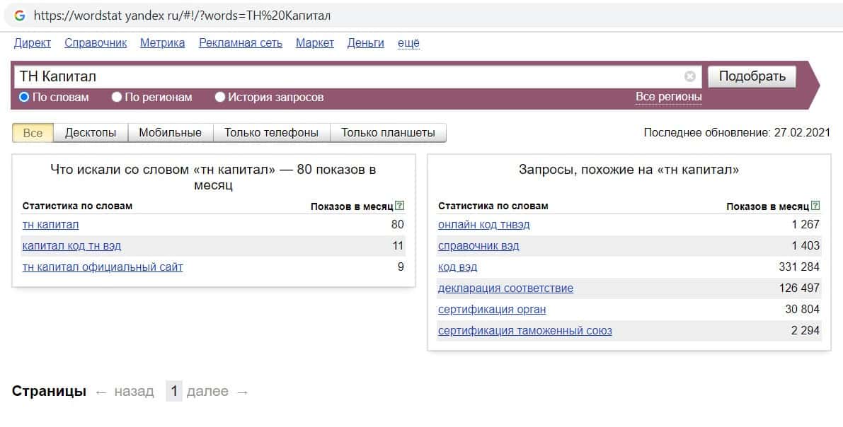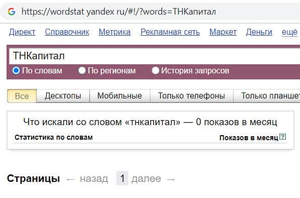 Далее мы проверили количество запросов фирмы ТН Капитал по русскоязычному названию, но без пробела, а именно "ТНКапитал", но данный запрос никто не выполнял.