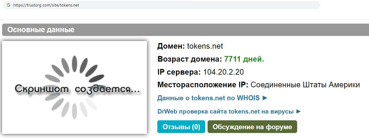 Для того что бы узнать настоящий возраст компании аферистов Tokens Net - мы проверили её через интернет ресурс "Доверие в Сети". Оказалось, что компании уже 7711 дней, то есть компании уже 21 год, но откуда такая цифра? При таком опыте и возрасте компании она должна быть всемирно известна и в сети была бы куча информации о них, но интернету о них почти ничего не известно.