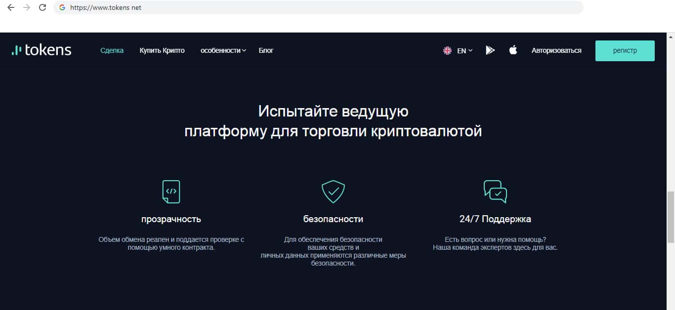 На сайте лохотрон Tokens Net разместил информацию о том, что их платформа почему то стала ведущей для торговлю криптовалютой. Кидалы гарантируют прозрачность, которой нет и никогда не будет, так как компания будет терять деньги, безопасность, а так же поддержку круглосуточную, но только она будет действовать до тех пор, пока пользователь вкладывает деньги в фирму.