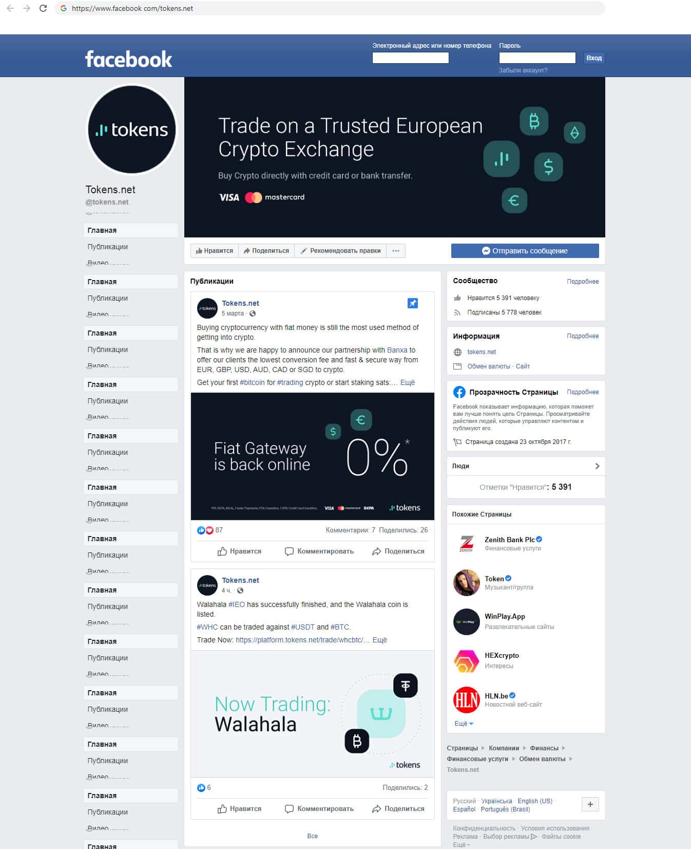 Жулики Токенс Нет зарегистрировали свою страницу в самой популярной социальной сети в мире - фейсбуке. Тм махинаторы набрали уже более 5700 подписчиков, и каждый день пытается заманить к себе нового пользователя, соблазняя его выгодными предложениями и ложной информацией о компании.