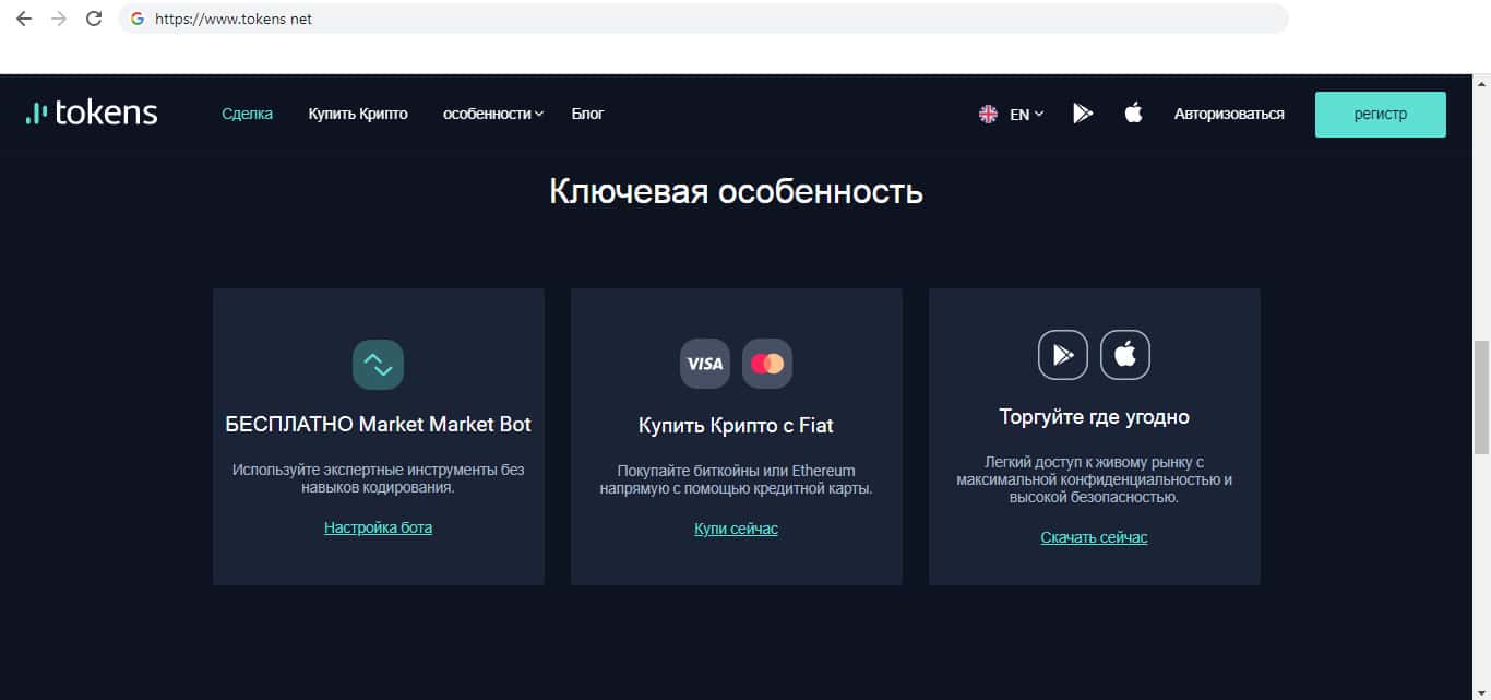 Так же фирма на сайте демонстрирует пользователям свои ключевые особенности. Такими особенностями являются: бот. который всё будет делать за пользователя и якобы использовать экспертные инструменты, возможность покупки биткоина прямо с карты, и лёгкий доступ к живому рынку с помощью мобильных приложений, и как утверждает фирма Tokens Net это очень безопасно, что ничем не подтверждено.
