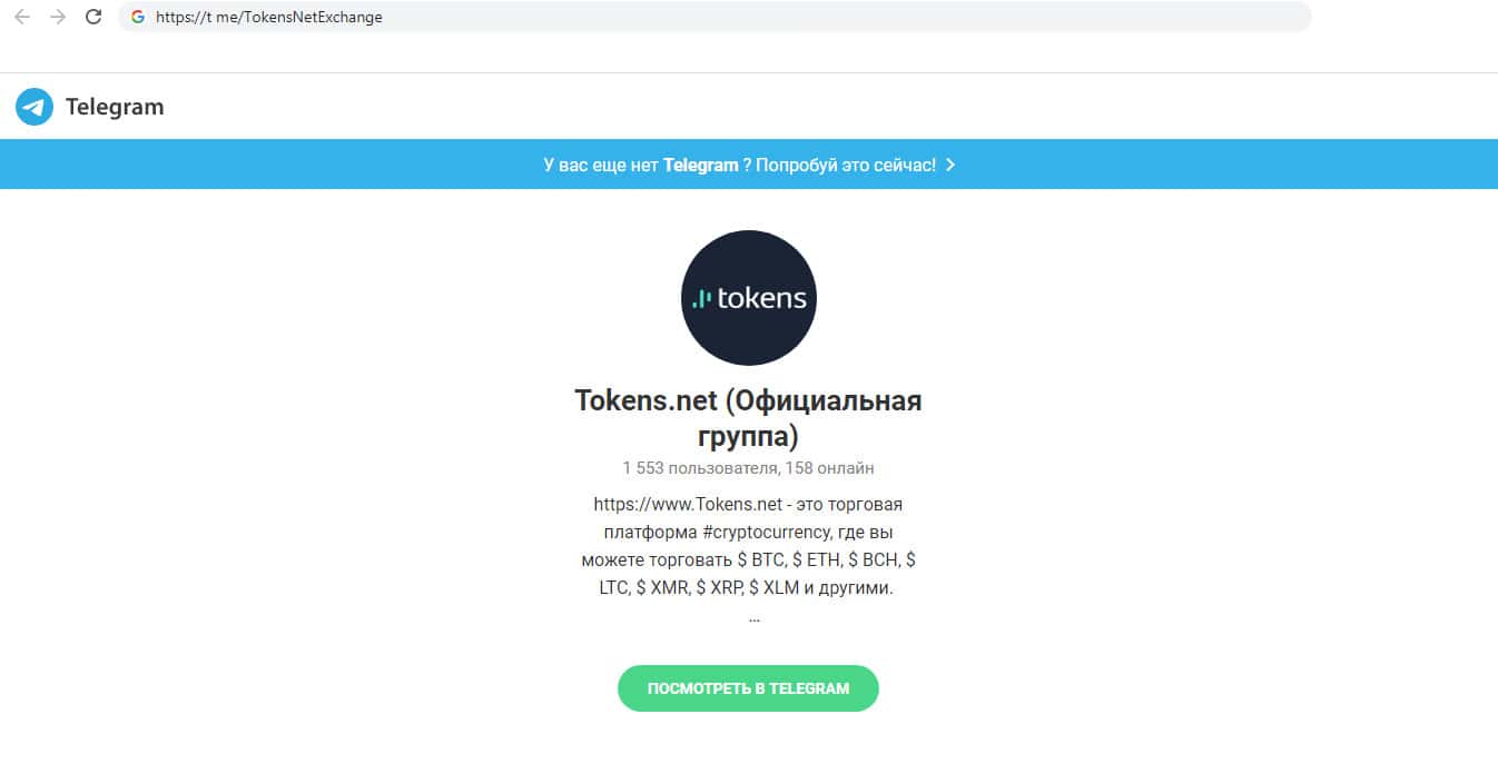 Так же аферисты Tokens Net завели закрытый канал в телеграмм, там они собрали более полторы тысячи участников. Но онлайн из них очень мало, так что опять они просто накрутили себе участников, что бы показать самым наивным пользователям, что имеют хоть какую то популярность. На самом деле большая часть этих подписчиков просто вымысел.