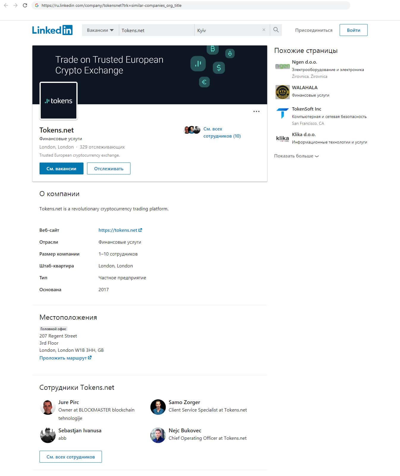 В социальной сети для поиска и установления деловых контактов - linkedin com, компания разводил Tokens Net так же завела аккаунт, но вот только там они не имеют такой популярности как предыдущие страницы. Там они набрали всего 329 подписчиков, хотя исходя из "опыта" компании должно быть намного больше.