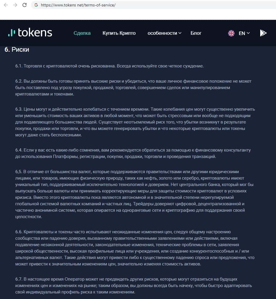 Мошенническая компания Токенс Нет на своём главном сайте предоставила пользователям предупреждение о рисках, в котором указывают, что торговля криптовалютой это очень рискованно и компания не будет нести ответственности за любые убытки клиента, даже если они случились по вине компании.