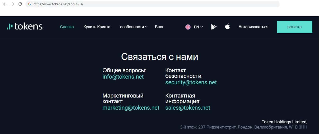 Кидалы Tokens Net предоставили свои контактные данные своей компании. Фирма предоставила лишь адреса электронной почты, и не более. номер телефона отсутствует, компания отказывается напрямую общаться с клиентами, тем более что по условиям соглашения имеют право не отвечать на письма клиентов. Контакты разводил:
