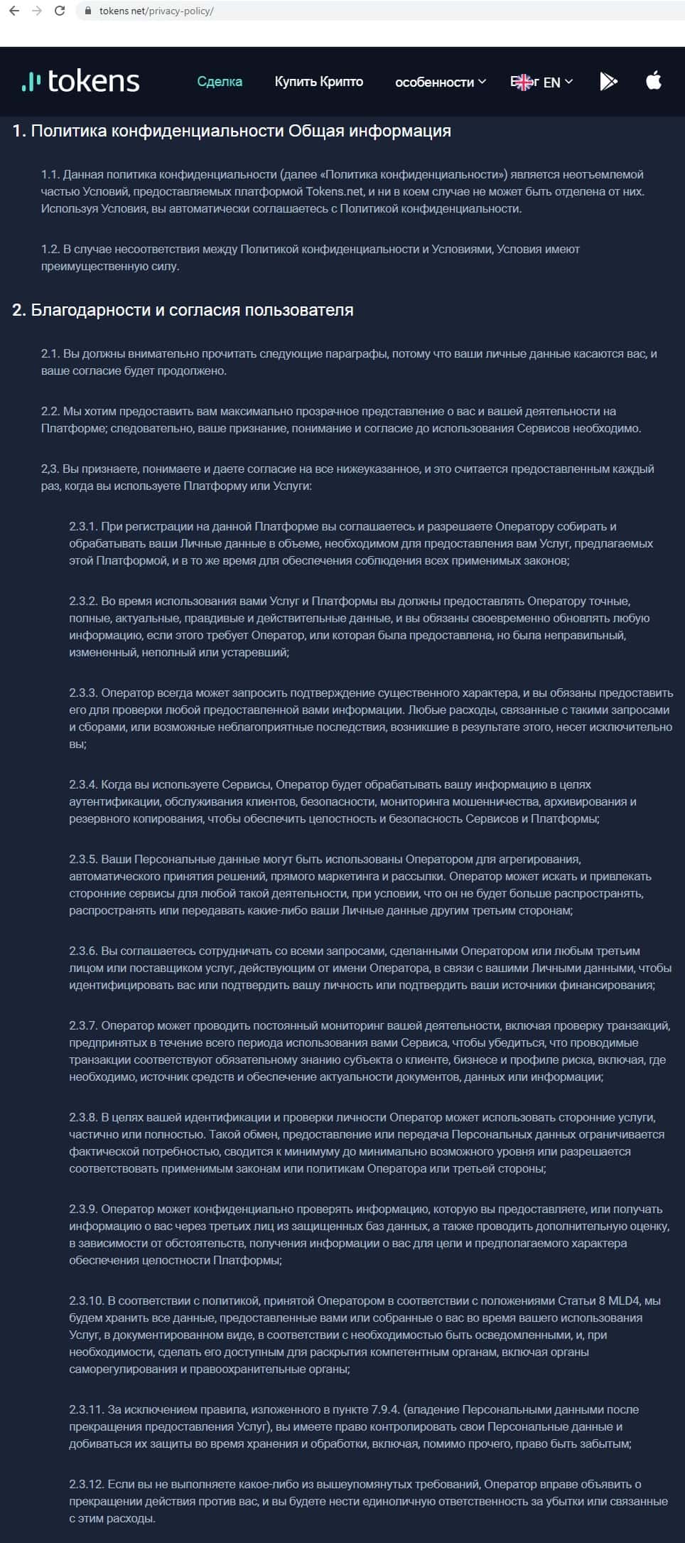 Так же махинаторы Токенс Нет предоставили политику конфиденциальности, в которой рассказывают пользователям о том, что они должны предоставлять информацию о себе, и вносить изменения, если такие произошли с документацией клиентов. Не исключено, что компания просто торгует данными пользователей, и за деньги предоставляет их другим мошенническим организациям.