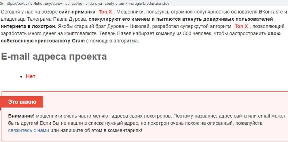 Вернее, проект-то один, но вот посадочных страниц он имеет несколько, так что жулики Ton-X Net могут без проблем сворачивать их в случае опасности. На каждом зеркале та же легенда - Павел Дуров набирает 500 человек, чтобы осчастливить, а нужно ему это только для того, чтобы они помогли ему продвигать новую криптовалюту в мир... как-то так.