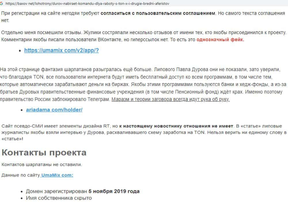 К созданию следующей ловушки плуты Ton-X Net подошли с огоньком. Ресурс ariadama com успешно косит под онлайн-издание RT. Здесь выложено фиктивное интервью с Павлом Дуровым, в котором он якобы рассказывает о псевдо-алгоритме Тон Х и зазывает людей им воспользоваться. Абсолютно все ссылки ведут на страничку регистрации umamix com.