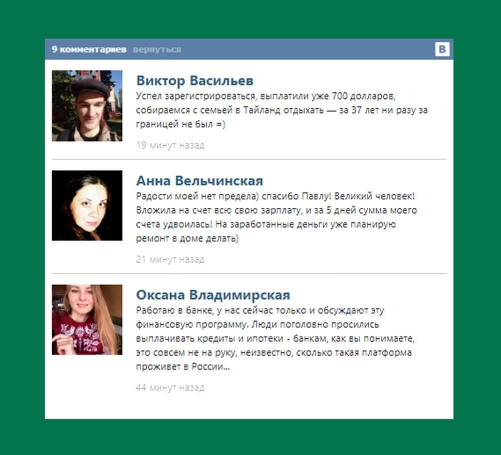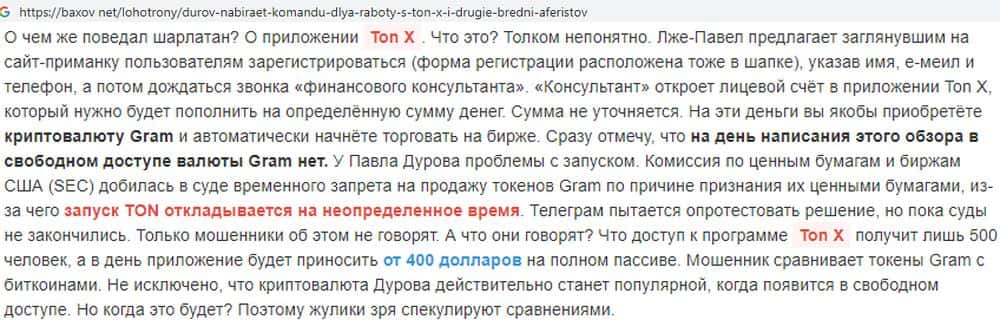 Все, на что хватило воображения проныр Ton-X Net - короткая инструкция из трех пунктов, выполнив которые, каждый сможет якобы получать по 400 долларов в день и псевдоцитаты от Дурова... еще бы парочку цитат Конфуция добавили. Предложение, конечно, соблазнительное, но вряд ли найдется инвестор в здравом уме, который поведется на подобный развод.