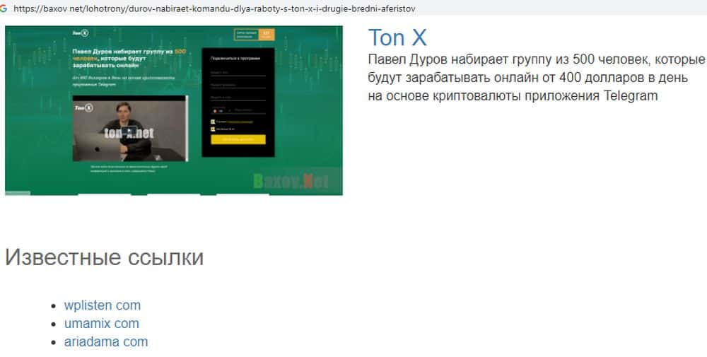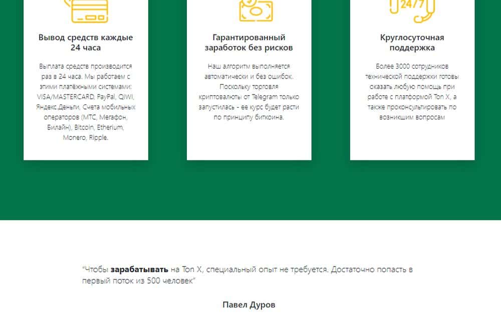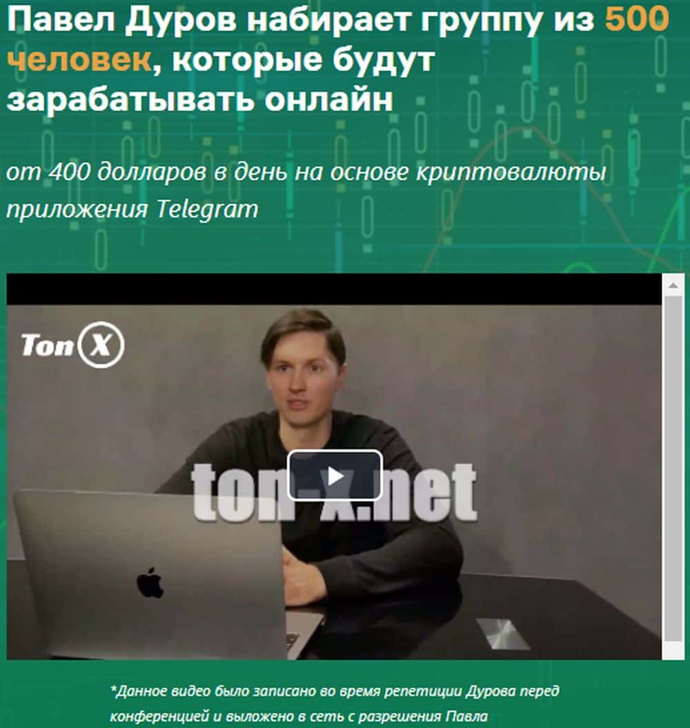 Сайт проходимцев Ton-X Net сделан настолько убого, что даже как-то смешно предполагать, что к нему может иметь отношение Павел Дуров, создатель ВКонтакте и Телеграм. Мерзко-зеленый одностраничник Ton-X Net, тем не менее, не постеснялся понавешать везде его фотографий и липовых цитат с обещаниями заработка.