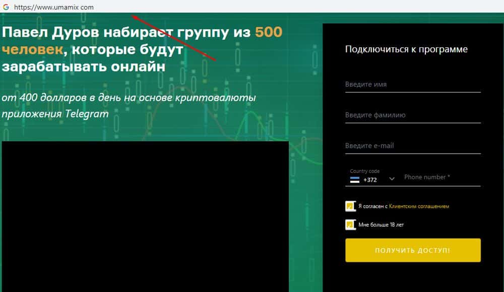 Начинается страничка с видео, на котором якобы сам Павел Дуров рассказывает о чудо-алгоритме и обещает, что позволит первым 500 инвесторам, которые успеют зарегистрироваться на кривом сайте, пользоваться им. Актер похож на создателя мессенджеров ну очень отдаленно, тут вообще непонятно, на что рассчитывали лохотронщики.