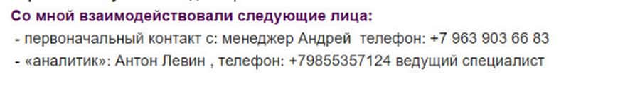 Клиент, которого кинули на деньги, указал в своей жалобе телефонные номера мошенников из Тон Компани. Девушке звонили менеджер Андрей и Антон Левин, аналитик.