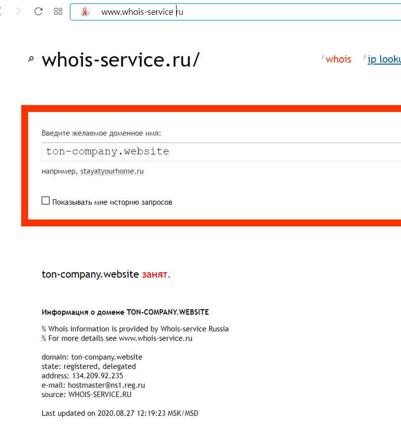 Кому принадлежит доменное имя сайта Ton-Company Website, выяснить нельзя, потому что мошенники полностью скрыли информацию о владельце сайта.